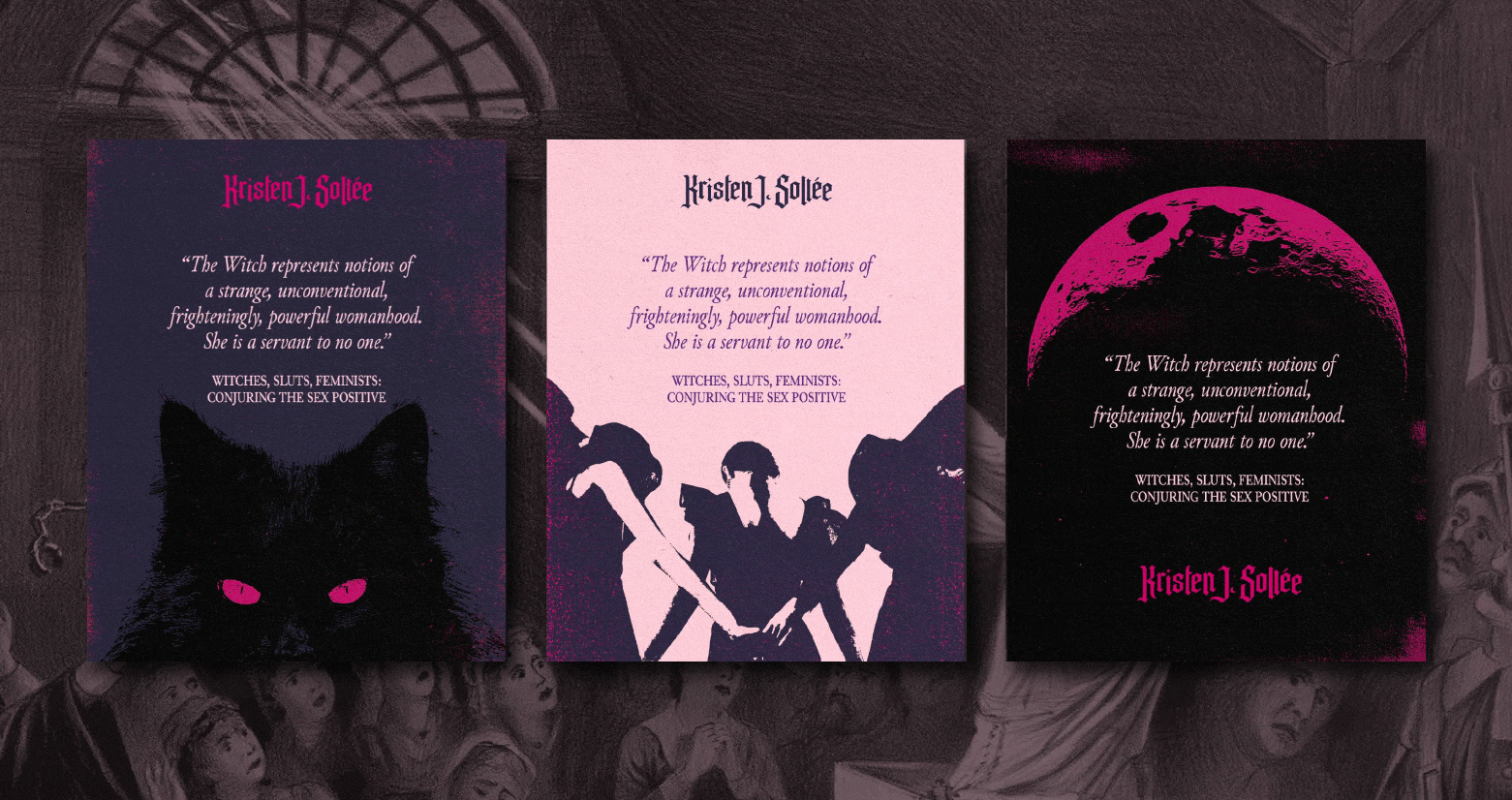 We set out to create a brand that embraced the entire Kristen — her dark historical depth, irreverent wit, and rock-and-roll energy. Every element was intentional: from a blackletter logo suite that could grace either a scholarly book or a glam metal poster, to a bold “bisexual lighting” color palette of saturated pinks and purples.